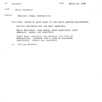 A memo prepared by Gerry Thompson to Governor Atiyeh on March 16, 1982. This memo includes three potential candidates, Darrell Garretson, Wayne Harrison, and Cliff Ross, for a pending appointment with District Judge, McMinnville. This is one document from a binder containing selected daily reports to the Governor, which was compiled by Gerry Thompson.
