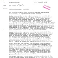A memo prepared by Bob Oliver, Legal Counsel, reporting to Governor Atiyeh on June 23, 1982. The report covered topics including: the US Forest Service, U.S. Geological Survey (USGS) and the Oregon Department of Geology and Minerals Industries (DOGAMI); Teamsters approved Oregon Liquor Control Commission (OLCC) employees work hours; the State Police and punitive damages. This is one document from a binder containing selected daily reports to the Governor, which was compiled by Gerry Thompson.