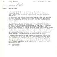 A memo prepared by Bob Oliver, Legal Counsel, reporting to Gerry Thompson on September 17, 1982. This report concerns Willamette Week's article on the Duane Samples Case and a subsequent meeting that Bob Oliver attended in the fall of 1979. The meeting was on a testimony for Duane Samples' wife, Tanya Samples, who was employed by Pihas, Ron Schmidt, and Westerdahl. This is one document from a binder containing selected daily reports to the Governor, which was compiled by Gerry Thompson.