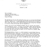 A letter addressed to the Executive Vice President of the Oregon Association of Realtors, Max B. Chapman, by Governor Atiyeh on October 8, 1982. Governor Atiyeh explains that federal law restrictions are preventing the Mortgage Purchase Program from operating at profit. The Mortgage Purchase Program can be reevaluated if estate fees under the Housing Division and mortgage loans improve. This is one document from a binder containing selected daily reports to the Governor, which was compiled by Gerry Thompson.