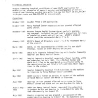 A timeline of events from the Douglas Community Hospital and an attachment from the State Health Planning and Developing Agency (SHPDA). The timeline from October 1981 through September 1982 includes efforts made by the Douglas Community Hospital to be granted with a Certificate of Need. The attachment from the SHPDA lists reasons for denying the Certificate of Need application. Topics also include: the State Health Plan; Western Oregon Health Systems; Roseburg hospital; and Mercy Medical Center. This is one document from a binder containing selected daily reports to the Governor, which was compiled by Gerry Thompson.