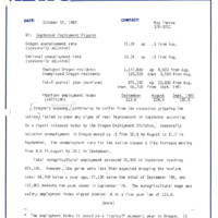 A written report displaying unemployment figures released by the State of Oregon Employment Division on October 12, 1982. The employment index shows relative figures using 1982 as the base year to compare fluctuations in the current month. Employment in machinery, instruments, and paper are general weaknesses in the economy. Employment in food service, lumber, construction and education are noted as either stable or increasing. This is one document from a binder containing selected daily reports to the Governor, which was compiled by Gerry Thompson.