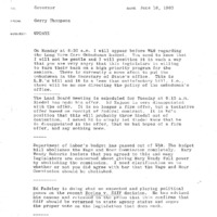 A memo prepared by Gerry Thompson reporting to Governor Atiyeh on June 18, 1983. This report addressed topics including: the Long Term Care Ombudsman budget; the Land Board; the Wage and Hour Commission; the Eccles v. SAIF; OPEU state employee union; Jim Sexson; and the National Council on Compensation Insurance (NCCI) cents per hour study. This is one document from a binder containing selected daily reports to the Governor, which was compiled by Gerry Thompson.