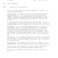 A memo prepared by Gerry Thompson reporting to Governor Atiyeh on July 26, 1983. This meeting addresses Leo Hegstrom, Director of the Oregon Department of Human Resources, and the current division head positions. Topics of discussion include: Workers Compensation, the Public Utility Commission (PUC), the Employment Division; and the Handicap Commission. This is one document from a binder containing selected daily reports to the Governor, which was compiled by Gerry Thompson.