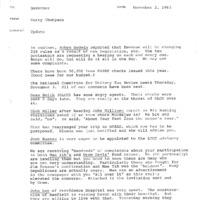 A memo on a daily update by Gerry Thompson reporting to Governor Atiyeh on November 2, 1983. This report covers topics including: the National Committee for Unitary Tax Review; Mae Yih and Drew Davis fundraiser; and the Providence Hospital. This is one document from a binder containing selected daily reports to the Governor, which was compiled by Gerry Thompson.