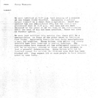 A memo prepared by Gerry Thompson reporting to Governor Atiyeh on December 2, 1983. Topics in this report include a suicide conducted at the Oregon State Hospital and a demonstration taking place in front of a manufacturing plant owned by Precision Castparts. This is one document from a binder containing selected daily reports to the Governor, which was compiled by Gerry Thompson.