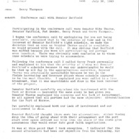 A memo on the Port of Morrow issue by Gerry Thompson reporting to Governor Atiyeh on July 20, 1983. A conference call with Senator Hatfield and Mike Thorne advised diversification for the Port of Morrow under good faith negotiations from Governor Atiyeh, Pat Amedeo, Ed Zajonc and Gerry Thompson. Topics following that call include: Port of Morrow people meeting; Wayne Schwandt intervention; Land Board and the Emergency Board. This is one document from a binder containing selected daily reports to the Governor, which was compiled by Gerry Thompson.