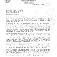 A letter from the US Department of the Interior Fish and Wildlife Service by Richard J. Myshak, Regional Director, appointing Governor Atiyeh on October 21, 1983. This memo addressed Ed Zajonc, the head of a State Land agency, and his lack of professionalism in response to Section 7 consultation under the Endangered Species Act and the Corps of Army Engineers' permission. This is one document from a binder containing selected daily reports to the Governor, which was compiled by Gerry Thompson.