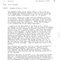 A memo on the Premier of China's visit by Gerry Thompson reporting to Governor Atiyeh on January 9, 1984. Topics addressed in this report included the Premier of China's whereabouts in Honolulu, Virginia, Washington DC, San Francisco, and New York and Gov. Atiyeh's formal Nike invitation to attend meeting in California. This is one document from a binder containing selected daily reports to the Governor, which was compiled by Gerry Thompson.