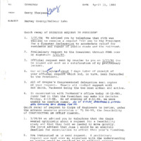 A memo titled 'Harney County/Malheur Lake' prepared by Gerry Thompson to Governor Atiyeh on April 11, 1984. Topics addressed in this memo include a timeline of events on the disaster declaration request to the president and Corps of Engineering on constructing an outlet channel. This memo also covered topics including: FEMA; Congressman Bob Smith and Senator Robert Packwood; and Lynn Hardy, emergency management. This is one document from a binder containing selected daily reports to the Governor, which was compiled by Gerry Thompson.