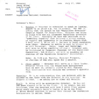 A memo prepared by Gerry Thompson reporting to Governor Atiyeh, Denny Miles, and Lon Holbrook on July 17, 1984. Topics addressed in this memo include a 'Republican Governors' Campaign Report for Reagan-Bush' speech request by the Republican National Convention (RNC) held on August 21, 1984. Memo also includes security, staff, housing, and transportation information. This is one document from a binder containing selected daily reports to the Governor, which was compiled by Gerry Thompson.