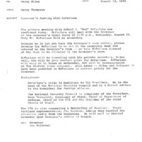 A memo prepared by Gerry Thompson reporting to Denny Miles, Press Secretary, on August 14, 1984. This memo includes confirmation of a private meeting with Robert C. McFarlane, Assistant to the President and head of the National Security Council, on August 22, 1984. Upon Gov. Atiyeh's arrival to Oregon after the meeting, CIA is requesting a debrief session as McFarlane has direct contact with foreign affairs. This is one document from a binder containing selected daily reports to the Governor, which was compiled by Gerry Thompson.