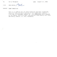 A memo prepared by Bob Oliver, Legal Counsel, reporting to Gerry Thompson on August 27, 1984. This memo is in response to Gerry Thompson informing her that the Bomb Committee has been organized with a first meeting set for August 30, 1984. This is one document from a binder containing selected daily reports to the Governor, which was compiled by Gerry Thompson.