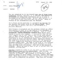 A memo prepared by Gerry Thompson reporting to Governor Atiyeh on August 30, 1984. Topics addressed in this memo include: Anti Son of Three Press Conference; Parole Board; Stephen Spielberg movie in Astoria Warner Bros.; Oregon Department of Land Conservation and Development (LCDC) community of Tangent proposal; and the timber industry. This is one document from a binder containing selected daily reports to the Governor, which was compiled by Gerry Thompson.