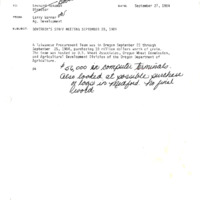 A memo prepared by Larry Warner, Agricultural Development, reporting to Governor Atiyeh on September 27, 1984. Topics include a Taiwanese Procurement Team hosted by the US Wheat Associates, Oregon Wheat Commission, and Agricultural Development Division. A handwritten note also mentions purchase of logs in Medford. This is one document from a binder containing selected daily reports to the Governor, which was compiled by Gerry Thompson.