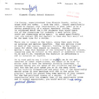 A memo prepared by Gerry Thompson reporting to Governor Atiyeh on January 30, 1985. In this memo Jim Conroy, superintendent from Klamath County, is expressing concern of a potential school teachers' strike. Issues include salaries, medical benefits, and funding that is linked to the Governor's tax rate freeze. This is one document from a binder containing selected daily reports to the Governor, which was compiled by Gerry Thompson.