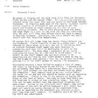 A memo prepared by Gerry Thompson reporting to Governor Atiyeh on March 13, 1985. This memo addresses rumors about Gov. Atiyeh challenging Senator Packwood. Such rumors have made Packwood's staff in D.C. and in Portland, including Elaine Franklin, place extra attention on the Governor's office and workers. This is one document from a binder containing selected daily reports to the Governor, which was compiled by Gerry Thompson.