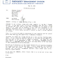 A memo prepared by Lyn Hardy, Administrator of the Emergency Management Division of the Executive Department in the State of Oregon, to the Atiyeh Administration, on May 20, 1986. Attached is an incident critique and debriefing report from Lyn Hardy and an addendum from Tom Warden reported on May 8, 1986. Topics in these reports include: the Public Officials' Conference; Civil Air Patrol (C.A.P.) and Aeronautics Division; Oregon State Police and EMD efforts; 'COA' coding for coastal counties; press being removed from E.O.C.; and the Legislative Leadership. This is one document from a binder containing selected daily reports to the Governor, which was compiled by Gerry Thompson.
