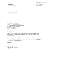 A letter from J.H. Stever, Vice President at Pacific Northwest Bell, to Gerry Thompson on September 9, 1986. This is a 'thank you' letter regarding the Colorado trip that Gerry Thompson accompanied Stever and two others. This is one document from a binder containing selected daily reports to the Governor, which was compiled by Gerry Thompson.