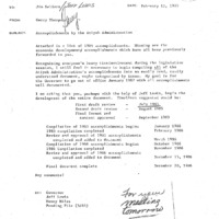 A memo prepared by Gerry Thompson to Jim Sellers on February 13, 1985. This memo recognizes a timeline starting in July 1986 to document the Atiyeh Administration's accumulated accomplishments in an easy read fashion. The second and third attachment includes handwritten notes by Gov. Atiyeh suggesting to recover the promises made by the administration in 1978 during the campaign. This is one document from a binder containing selected daily reports to the Governor, which was compiled by Gerry Thompson.
