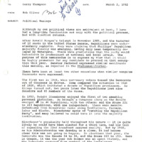 A memo prepared by Bob Oliver, Legal Counsel, to Gerry Thompson on March 2, 1982. Topics addressed in this memo include: Ronald Reagan 1980; Statesman-Journal; Dwight Eisenhower; Republican party races in Idaho, Indiana, Wisconsin, New York, Arizona; Senatorial elections; and 1981 Republican Almanac figures. This is one document from a binder containing selected daily reports to the Governor, which was compiled by Gerry Thompson.