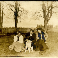 Two women, a man and a dog pose for a picture in front of a fence, probably in Oregon. The woman on the right may be Winnette Sears. This photograph was found in an album labelled "Photones", which is part of the Charles and Winnette Sears Walker Collection. Winnette was a 1906 alumna of Linfield College. Charles was an alumnus of Tualatin Academy who later became a musician and an insurance agent in Hillsboro, Oregon.