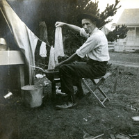 Charles L. Walker washing clothes and hanging them on a line. This photograph was found in an album labelled "Photones", which is part of the Charles Lovell and Winnette Sears Walker Collection. Winnette was a 1906 alumna of Linfield College. Charles was an alumnus of Tualatin Academy who later became a musician and an insurance agent in Hillsboro, Oregon.