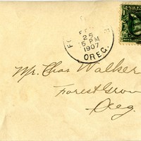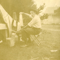 Charles L. Walker washing clothes and hanging them on a line. This photograph was mailed to "Mr. Chaz Walker," postmarked Feb 25, 1907 on the back. This photograph was found in an album labelled "Photones", which is part of the Charles Lovell and Winnette Sears Walker Collection. Winnette was a 1906 alumna of Linfield College. Charles was an alumnus of Tualatin Academy who later became a musician and an insurance agent in Hillsboro, Oregon.