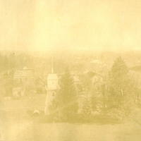 A birds-eye view of an unidentified town. This photograph was found in an album labelled "Photones", which is part of the Charles Lovell and Winnette Sears Walker Collection. Winnette was a 1906 alumna of Linfield College. Charles was an alumnus of Tualatin Academy who later became a musician and an insurance agent in Hillsboro, Oregon.