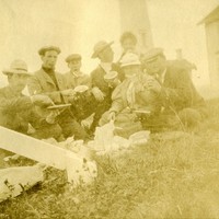 Seven people eating in the grass in front of the Yaquina Head Lighthouse, just north of Newport, Oregon.The second person from the left appears to be Charles L. Walker. This photograph was found in an album labelled "Photones", which is part of the Charles Lovell and Winnette Sears Walker Collection. Winnette was a 1906 alumna of Linfield College. Charles was an alumnus of Tualatin Academy who later became a musician and an insurance agent in Hillsboro, Oregon.