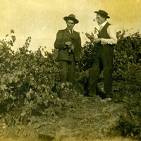 Two men stand in front of grape vines, probably at a vineyard in Northwestern Oregon. They each hold grapes in their hand. This photograph was found in an album labelled "Photones", which is part of the Charles Lovell and Winnette Sears Walker Collection. Winnette was a 1906 alumna of Linfield College. Charles was an alumnus of Tualatin Academy who later became a musician and an insurance agent in Hillsboro, Oregon.