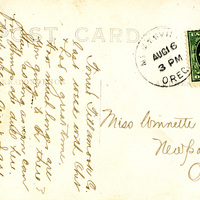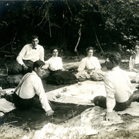 A group of three men and four women picnicking near the Willamette River around 1908. They appear to be eating cantaloupe. The photograph was printed on postcard stock and the back side includes a brief note from a man named "Cecil," writing from McMinnville, to Winnette Sears, who was in Newport, Oregon at the time. The men include Ralph Rees and Cecil; the women include "2 Gardner girls," Minnie Kincaid and Mabb Rush. This photograph is part of the Charles Lovell and Winnette Sears Walker Collection. Winnette was a 1906 alumna of Linfield College. Charles was an alumnus of Tualatin Academy who later became a musician and an insurance agent in Hillsboro, Oregon.