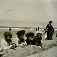 Four women wearing what appear to be fur hats lean against a log at a beach, probably in Oregon. The woman fourth from the left is Winnette Sears. This photograph is part of the Charles Lovell and Winnette Sears Walker Collection. Winnette was a 1906 alumna of Linfield College. Charles was an alumnus of Tualatin Academy who later became a musician and an insurance agent in Hillsboro, Oregon.