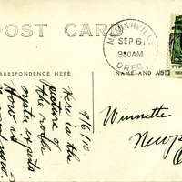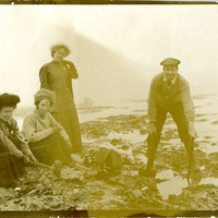 Three women and a man dig for oysters at the beach in Newport, OR. The woman third from the left is Winnette Sears. The photograph was printed on postcard stock and includes a brief note about the "oyster experts" pictured. The photograph is postmarked September 6, 1910 to "Winnette Sears". This photograph is part of the Charles Lovell and Winnette Sears Walker Collection. Winnette was a 1906 alumna of Linfield College. Charles was an alumnus of Tualatin Academy who later became a musician and an insurance agent in Hillsboro, Oregon.