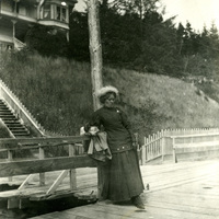 Winnette Sears leans against a fence on what appears to be a boardwalk. This photograph was probably taken on the Oregon coast, possibly in Newport. This photograph is part of the Charles Lovell and Winnette Sears Walker Collection. Winnette was a 1906 alumna of Linfield College. Charles was an alumnus of Tualatin Academy who later became a musician and an insurance agent in Hillsboro, Oregon.