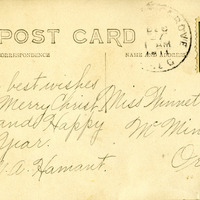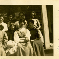 A group of approximately 10 unidentified women pose for a picture on the front porch of a house probably in Northwestern Oregon. The woman in the second row from the front on the far right is Winnette Sears. This photograph is printed on postcard stock and includes a note from M. A. Hamant. It is postmarked December 27, 1911. This photograph is part of the Charles Lovell and Winnette Sears Walker Collection. Winnette was a 1906 alumna of Linfield College. Charles was an alumnus of Tualatin Academy who later became a musician and an insurance agent in Hillsboro, Oregon.