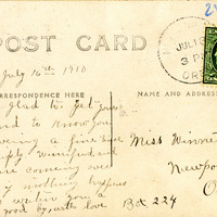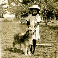 A young girl poses with a dog in a field, probably in Oregon. This photograph is printed on postcard stock and includes a brief note from "Mrs J. Eburale" to Winnette Sears written on July 16, 1910. This photograph is part of the Charles Lovell and Winnette Sears Walker Collection. Winnette was a 1906 alumna of Linfield College. Charles was an alumnus of Tualatin Academy who later became a musician and an insurance agent in Hillsboro, Oregon.