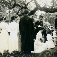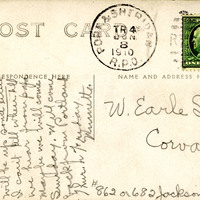 Unidentified performers put on a show for a large audience outdoors, probably in Oregon. This photograph is printed on postcard stock and includes a short note to "W. Earle Sears" from his sister Winnette Sears. It is postmarked June 8, 1910. This photograph is part of the Charles Lovell and Winnette Sears Walker Collection. Winnette was a 1906 alumna of Linfield College. Charles was an alumnus of Tualatin Academy who later became a musician and an insurance agent in Hillsboro, Oregon.