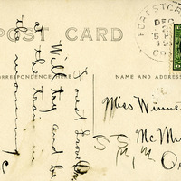 A side profile and head on portrait of an unidentified woman, probably produced in Oregon. These photographs are printed on postcard stock and includes a brief note to "Miss Winnette Sears". It is postmarked Dec 2, 1911. This photograph is part of the Charles Lovell and Winnette Sears Walker Collection. Winnette was a 1906 alumna of Linfield College. Charles was an alumnus of Tualatin Academy who later became a musician and an insurance agent in Hillsboro, Oregon.