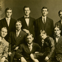 A group portrait of eleven unidentified men of various ages, probably produced in Oregon. This photograph is part of the Charles Lovell and Winnette Sears Walker Collection. Winnette was a 1906 alumna of Linfield College. Charles was an alumnus of Tualatin Academy who later became a musician and an insurance agent in Hillsboro, Oregon.