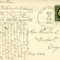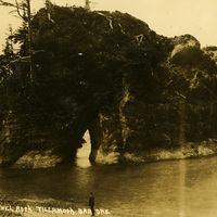An unidentified man stands in front of Tunnel Rock in Barview, Oregon. This photograph was printed on postcard stock and includes a note from "Katherine W.", addressed to "Mrs Charles L. Walker". It is postmarked August 17, 1914. This photograph is part of the Charles Lovell and Winnette Sears Walker Collection. Winnette was a 1906 alumna of Linfield College. Charles was an alumnus of Tualatin Academy who later became a musician and an insurance agent in Hillsboro, Oregon.