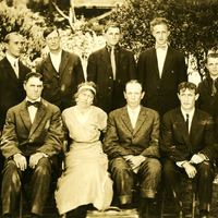 A group of people pose for a photograph outside, probably in Oregon. The front row from left to right: Walter Sears, Winnette Sears Walker, Charles Walker and Raleigh Walker. The back row remains unidentified. This photograph is part of the Charles Lovell and Winnette Sears Walker Collection. Winnette was a 1906 alumna of Linfield College. Charles was an alumnus of Tualatin Academy who later became a musician and an insurance agent in Hillsboro, Oregon.