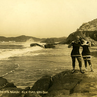 A souvenir postcard from Nye Beach, Oregon, portraying two women in 1910s-era swimming costumes. A small sea stack with an arch named Jump-off Joe, which collapsed in 1916, appears behind them. The Yaquina Head Lighthouse is in the distance. This photograph is part of the Charles Lovell and Winnette Sears Walker Collection. Winnette was a 1906 alumna of Linfield College. Charles was an alumnus of Tualatin Academy who later became a musician and an insurance agent in Hillsboro, Oregon.