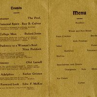 A pamphlet from the Fourth Annual Banquet for the Adelphic Fraternity on May 20, 1910. It includes a photograph of the Adelphic Fraternity members, a list of toasts to be performed, and a menu of available food. The banquet itself likely took place in Oregon. This piece is part of the Charles Lovell and Winnette Sears Walker Collection. Winnette was a 1906 alumna of Linfield College. Charles was an alumnus of Tualatin Academy who later became a musician and an insurance agent in Hillsboro, Oregon.