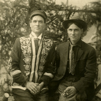 Walter Sears and an unidenitified man pose while sitting atop a wooden structure. Walter was a musician and his suit may be part of a band costume. This photograph is part of the Charles Lovell and Winnette Sears Walker Collection. Winnette was a 1906 alumna of Linfield College. Charles was an alumnus of Tualatin Academy who later became a musician and an insurance agent in Hillsboro, Oregon.