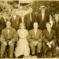 A group of eight young men and one woman pose for an outdoor group photograph, probably taken in Oregon. The front, seated row from left to right are identified as: Walter Sears, Winnette Sears Walker, Charles Lovell Walker, and Raleigh Clay Walker. The rest of the people remain unidentified. This photograph is part of the Charles Lovell and Winnette Sears Walker Collection. Winnette was a 1906 alumna of Linfield College. Charles was an alumnus of Tualatin Academy who later became a musician and an insurance agent in Hillsboro, Oregon.
