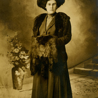 A formal studio portrait of an unidentified woman, probably taken in Oregon. She is wearing a fur hat, fur muff, a fur-trimmed coat and frameless glasses. This photograph is part of the Charles Lovell and Winnette Sears Walker Collection. Winnette was a 1906 alumna of Linfield College. Charles was an alumnus of Tualatin Academy who later became a musician and an insurance agent in Hillsboro, Oregon.