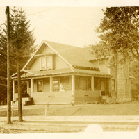 An unidentified craftsman-style house, possibly located in Forest Grove, Hillsboro, Yamhill, or McMinnville, Oregon. A woman sits on the porch and the street is partially dug up in the foreground. This photograph is part of the Charles Lovell and Winnette Sears Walker Collection. Winnette was a 1906 alumna of Linfield College. Charles was an alumnus of Tualatin Academy who later became a musician and an insurance agent in Hillsboro, Oregon.