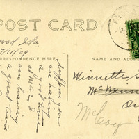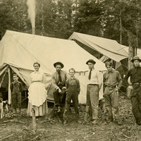 Eight unidentified people pose in front of a tent. The photograph is printed on postcard stock and includes a short note to Winnette Sears, dated from Fernwood, Idaho on July 11, 1909. The author of the note says that he is having a good time working as a transitman, which was a job related to surveying and building railroad lines. The camp is likely a work camp associated with a railroad. This photograph is part of the Charles Lovell and Winnette Sears Walker Collection. Winnette was a 1906 alumna of Linfield College. Charles was an alumnus of Tualatin Academy who later became a musician and an insurance agent in Hillsboro, Oregon.
