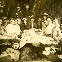 Seventeen people picnic in a forest, probably in Oregon. The man on the far left may be Walter Sears. The man standing in the very back on the right is Charles Walker. The woman sixth from the right is Winnette Sears. The man fourth from the right is probably Raleigh Walker. The rest remain unidentified. This photograph is part of the Charles Lovell and Winnette Sears Walker Collection. Winnette was a 1906 alumna of Linfield College. Charles was an alumnus of Tualatin Academy who later became a musician and an insurance agent in Hillsboro, Oregon.